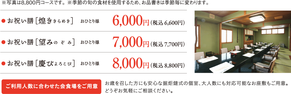 詳しくはお問い合わせください。 ※いずれも季節の旬の食材を使用するため、内容は季節毎に変わります。